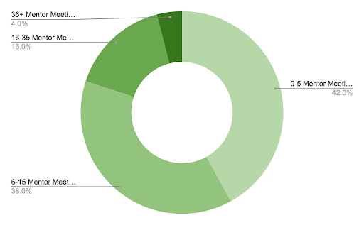As most would guess, the most common time for recruiting is fall. 83% of clubs reported having recruiting events in that semester. However, it may be surprising that the next most popular season was the Summer - 52% have recruiting events in the summer. Following Spring (47% reported recruiting events), there were also 16% of clubs that hosted recruiting events in the summer. - Club-reported Mentor Meetings