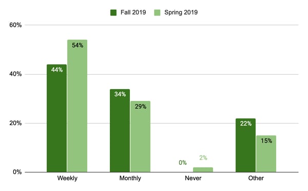 The most common cadence reported in the Fall 2019 survey was weekly, selected by 44% of respondents. Over ⅓ of respondents meet with their advisor monthly and just over 20% meet on a different frequency. (In the Spring 2019 survey, students and faculty/staff met even more often - with 54% meeting weekly and 29% monthly.)